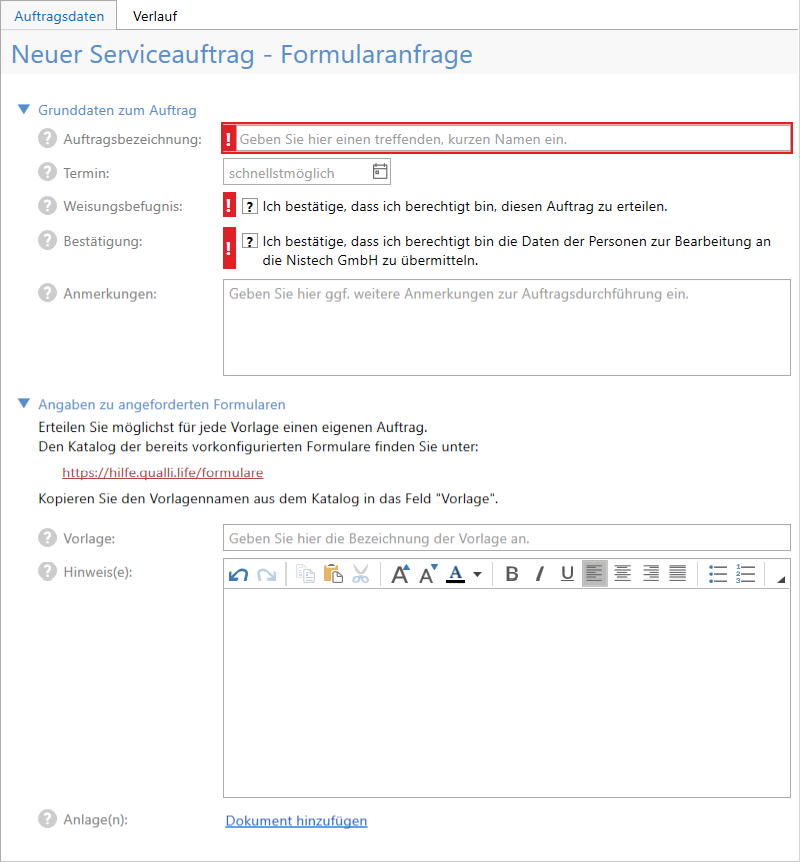 Speichern Sie Ihre Auswahl mit der Bestätigen-Schaltfläche. Es öffnet sich die Eingabemaske für die Formularanfrage. Klicken Sie auf einen Feldhinweis (