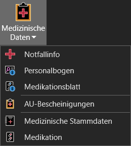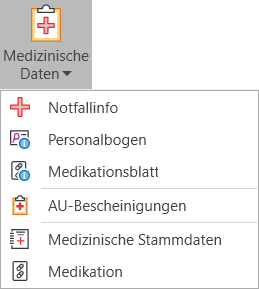"Medizinische Daten" öffnet normalerweise die Seite "AU-Bescheinigungen" und wird i.d.R. von allen Maßnahmetypen verwendet. Die Schaltfläche besitzt jedoch noch einen unteren Teil, auf den ein Pfeil hinweist (▼). Dies öffnet weitere medizinische Daten zur Person, die für Reha-Maßnahmen relevant sind.