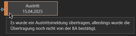 Die gelbe Farbe des Ereignisses zeigt an, dass eine Verarbeitung bzw. Bestätigung noch aussteht. In diesem Beispiel wurde eine Austrittsmeldung an die BA übermittelt, dessen Erhalt noch von der BA bestätigt werden muss. Auch hier erhalten Sie durch den Tooltip wichtige Informationen.