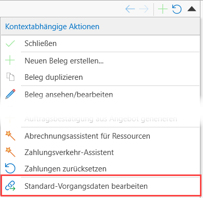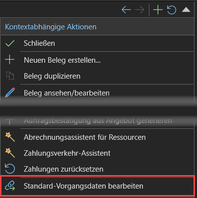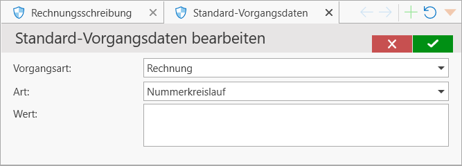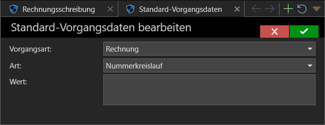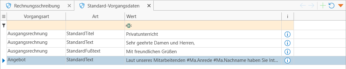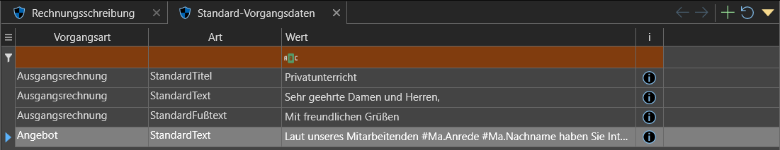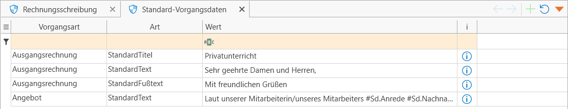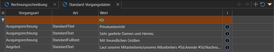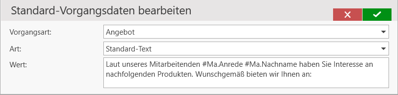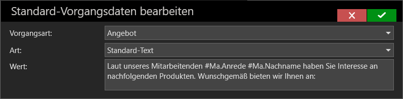 - Der Standardtext wird dann in die Standard-Vorgangsdaten aufgenommen.