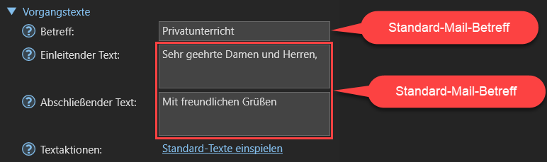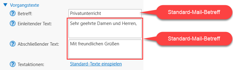 Standard-Betreff, -Text und -Fußtext werden in den Vorgangstexten verwendet.