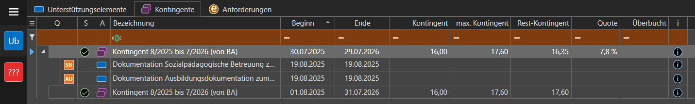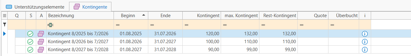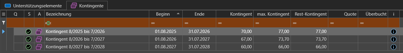 - Quote: Ein Prozentsatz, der angibt, inwieweit das Kontingent (nicht das max. Kontingent) aktuell belegt ist. Der Grundwert für diesen Prozentsatz ist stets das gemeldete Kontingent. Die Belegung wird durch die bedingte Formatierung zusätzlich farblich hervorgehoben: