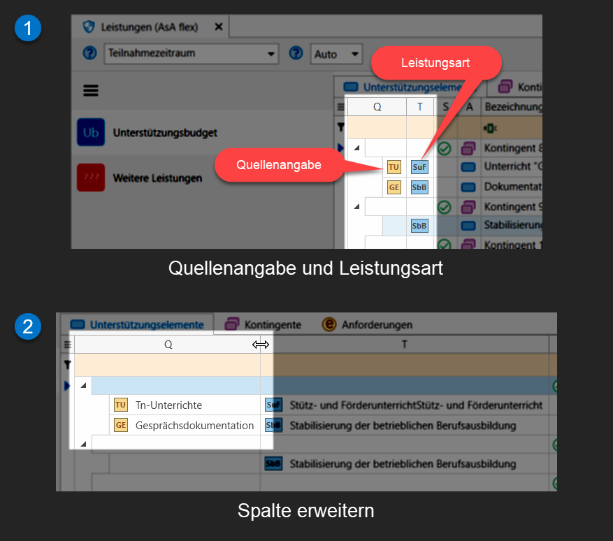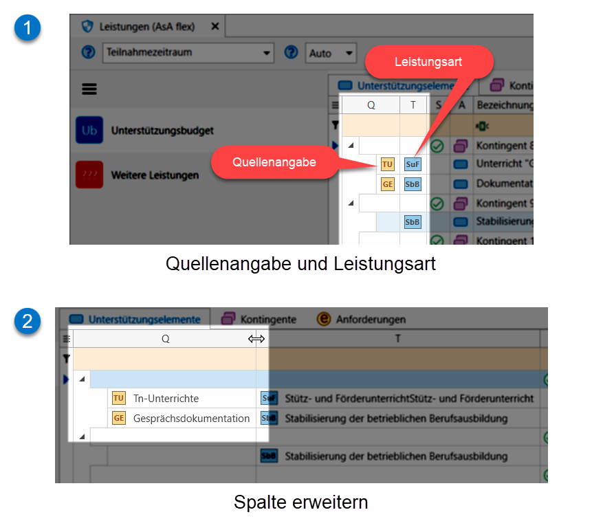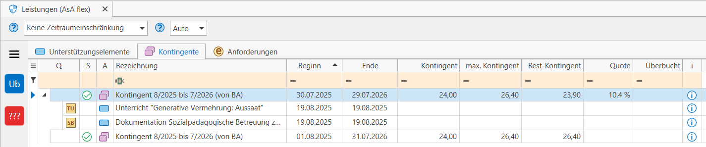 I.d.R. werden für AsA flex die Leistungen für SbB und SuF im Dokumentationsbereich oder im Kursbuch erfasst. Bei Bedarf können Sie jedoch auch in diesem Programmbereich Leistungen erfassen, allerdings wird kein Dokumentations- oder Kursbucheintrag generiert. Den hier erfassten Leistungen werden auch keine Quellen angegeben. Sie können Leistungen manuell in den Reitern "Unterstützungselemente" oder "Kontingente" hinzufügen: