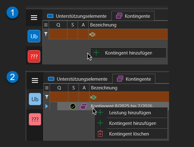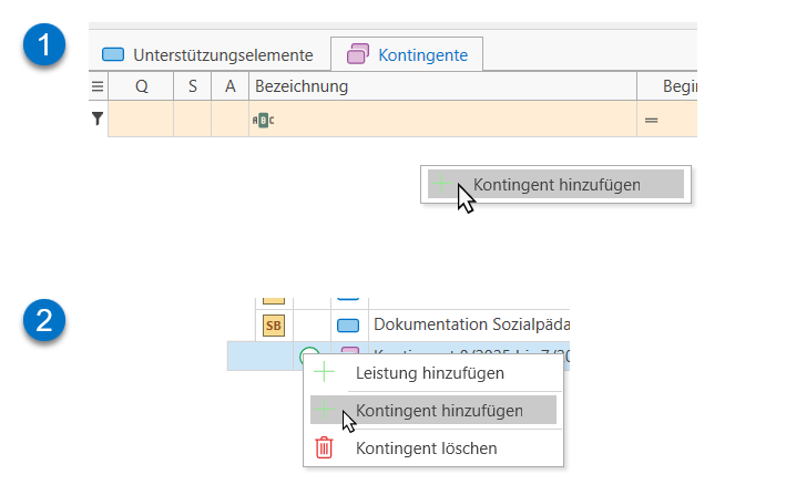 Für Tn, die nicht über die EMAW-Schnittstelle abgewickelt werden, müssen die Kontingente weiterhin manuell erfasst werden. Rechtsklicken Sie hierzu auf den Arbeitsbereich oder ein bereits erfasstes Kontingent und wählen Sie "Kontingent hinzufügen".