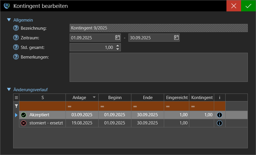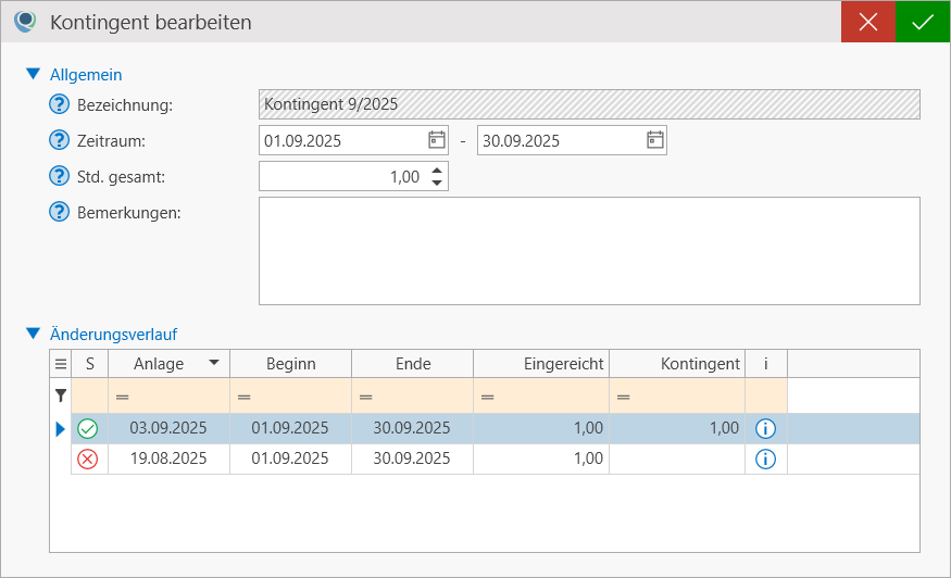 - Änderungsverlauf: Wurde das Kontingent im Laufe der Maßnahme geändert, wird hier in Tabellenform der Verlauf dokumentiert.