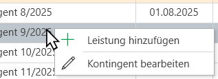 - Nach dem Bestätigen wird die Leistung anhand des eingetragenen Datums einem (Monats-)Kontingent zugeordnet.
