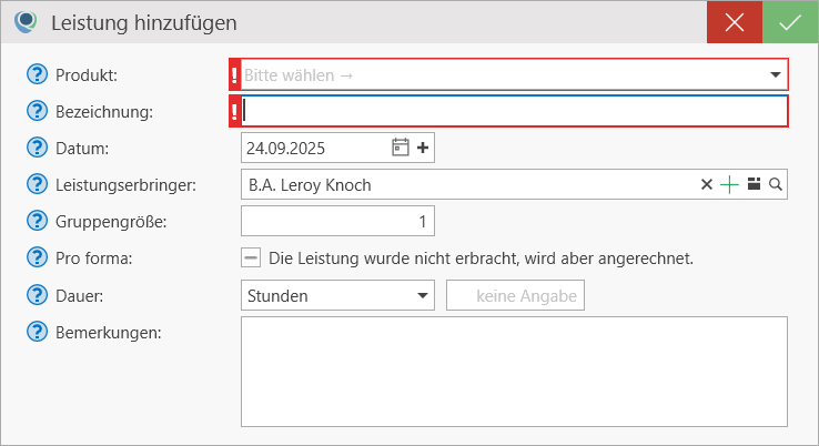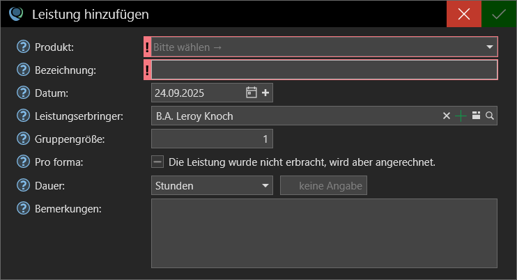 - Pro forma: Aktivieren Sie diese Option, wenn die Leistung nicht erbracht, aber dennoch angerechnet werden kann.