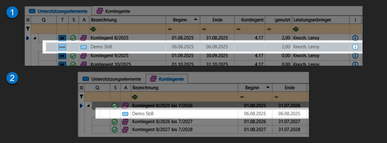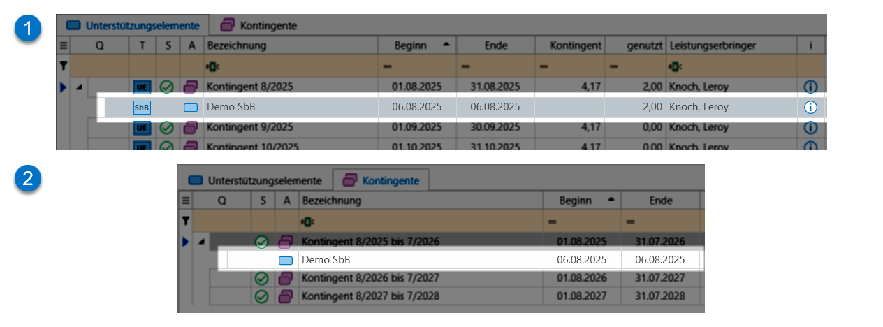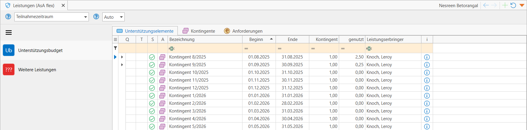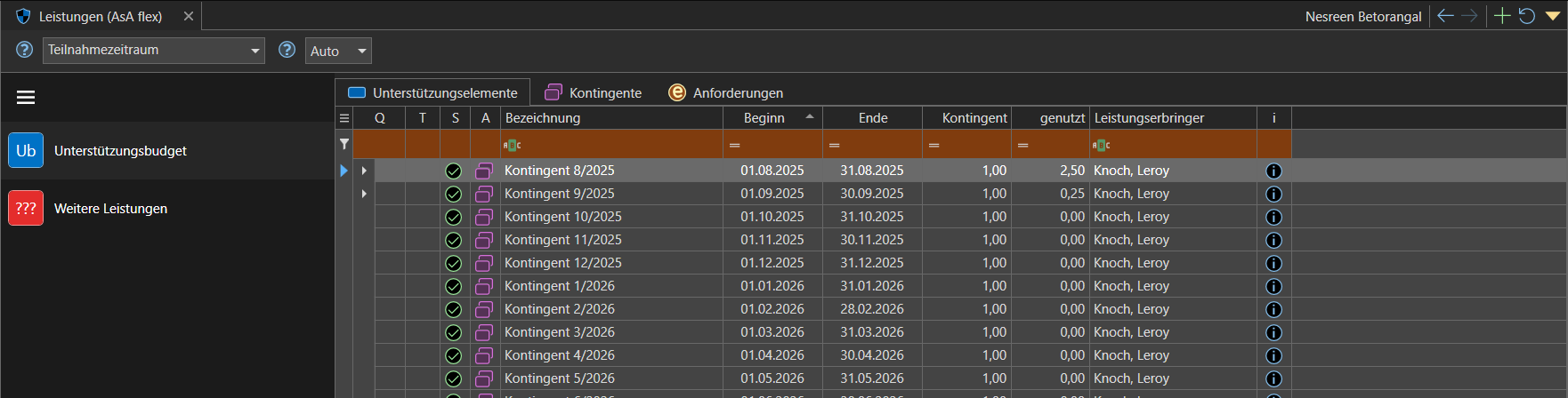 Das Zuordnen der Leistung ins Kontingent erfolgt stets durch die Angabe des Datums bzw. Zeitraums. Falls Leistungen fehlen sollten, überprüfen Sie die erfassten Leistungen im Bereich "Unterstützungselemente". Dort werden Leistungen, die keinem Kontingent zugeordnet werden konnten, als rote Zeile markiert (meist außerhalb des Teilnahmezeitraums). Korrigieren Sie das Datum der Leistung so, dass dieser sich innerhalb des Zeitraums des Kontingents befindet.